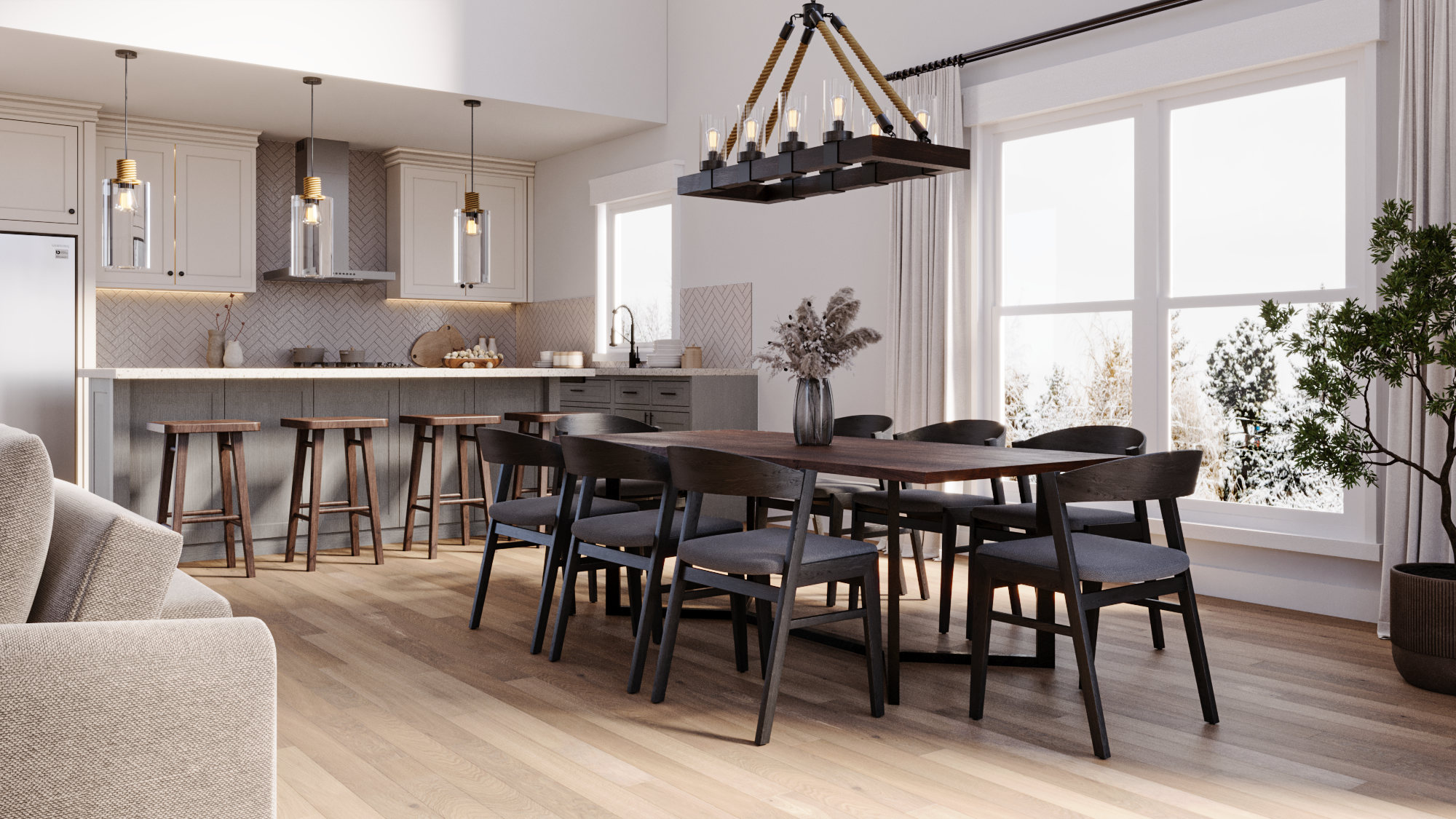 The Ellicott is a stunning 2420 sq chalet that can be configured with 4 or 5 bedrooms and up to 4 bathrooms. The main floor can have either 3 bedrooms or 2 bedrooms and an oversized entrance foyer. The kitchen is open plan with a breakfast bar or kitchen island that leads in to the dining room and living room. They all look up to a soaring vaulted ceiling with massive windows that flood the house with light. It’s a spectacular yet practical design.